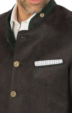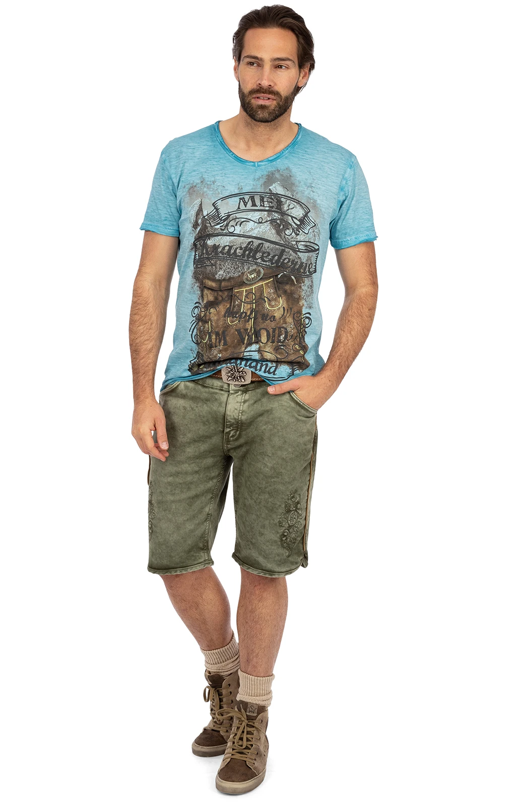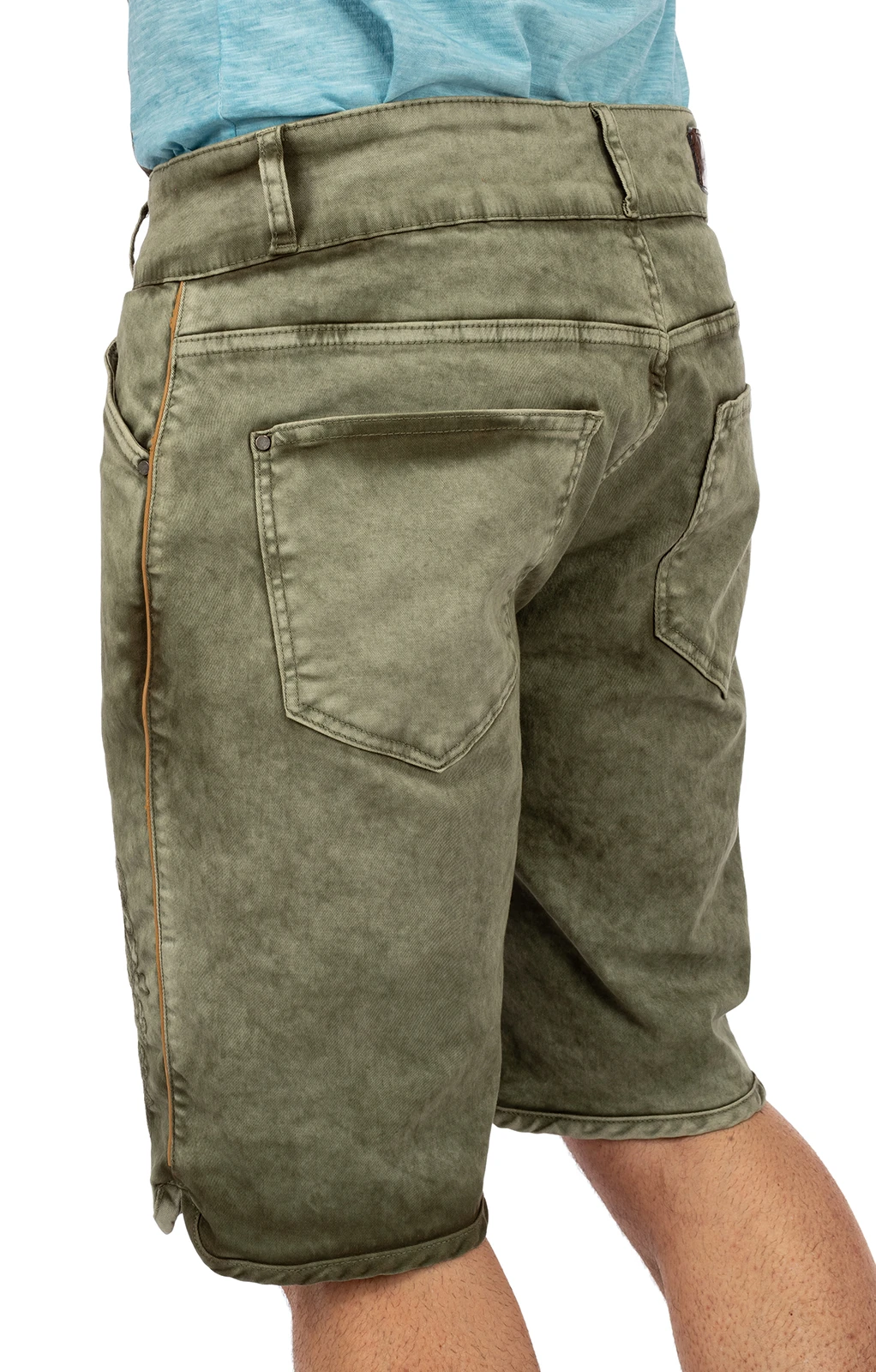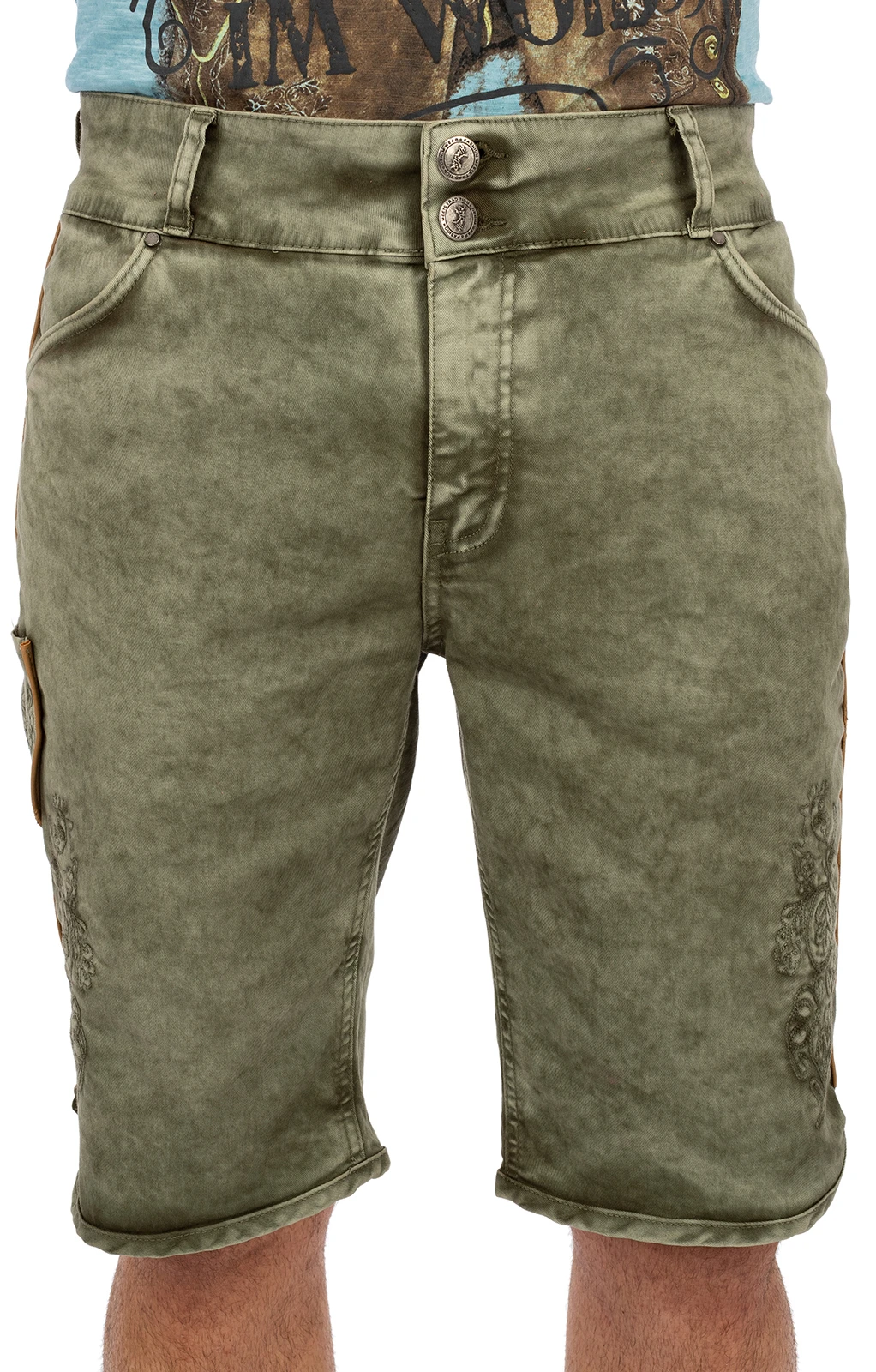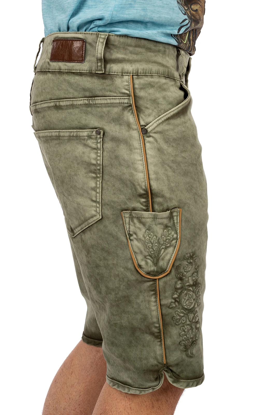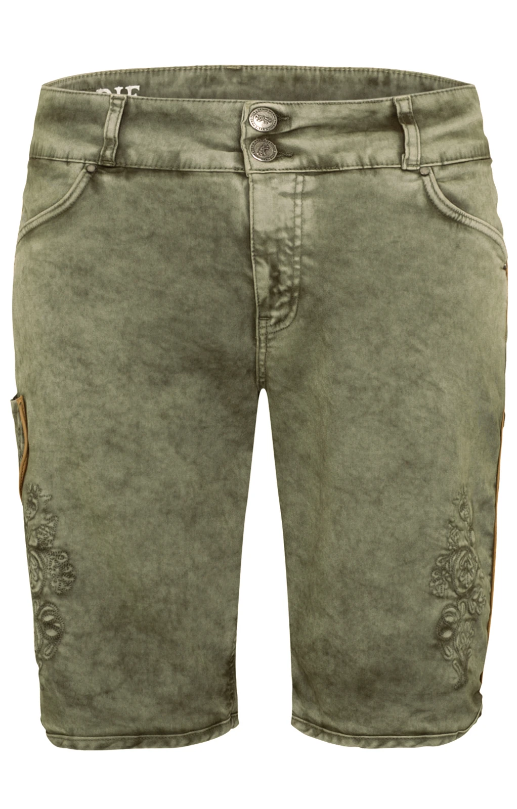 Mit HECTOR ins Vergnügen. Die kurze Trachtenjeans HECTOR im Farbton Army überzeugt mit einem tollen Sitz! Die knielange Hose besitzt einen breiten Bund, der mit zwei aufwendigen Trachtenknöpfen in Silber verschlossen wird. Denkbar ist auch, hier einen breiten Trachtengürtel zu einem flotten T-Shirt zu kombinieren. Optische Akzente setzen in Hellbraun abgesetzte Nähte an den Seiten und eine kleine Seitentasche. Geschwungene Stickereien sind weitere Hingucker: Sie nehmen Bezug zu Lederhosen im Trachtenstil.